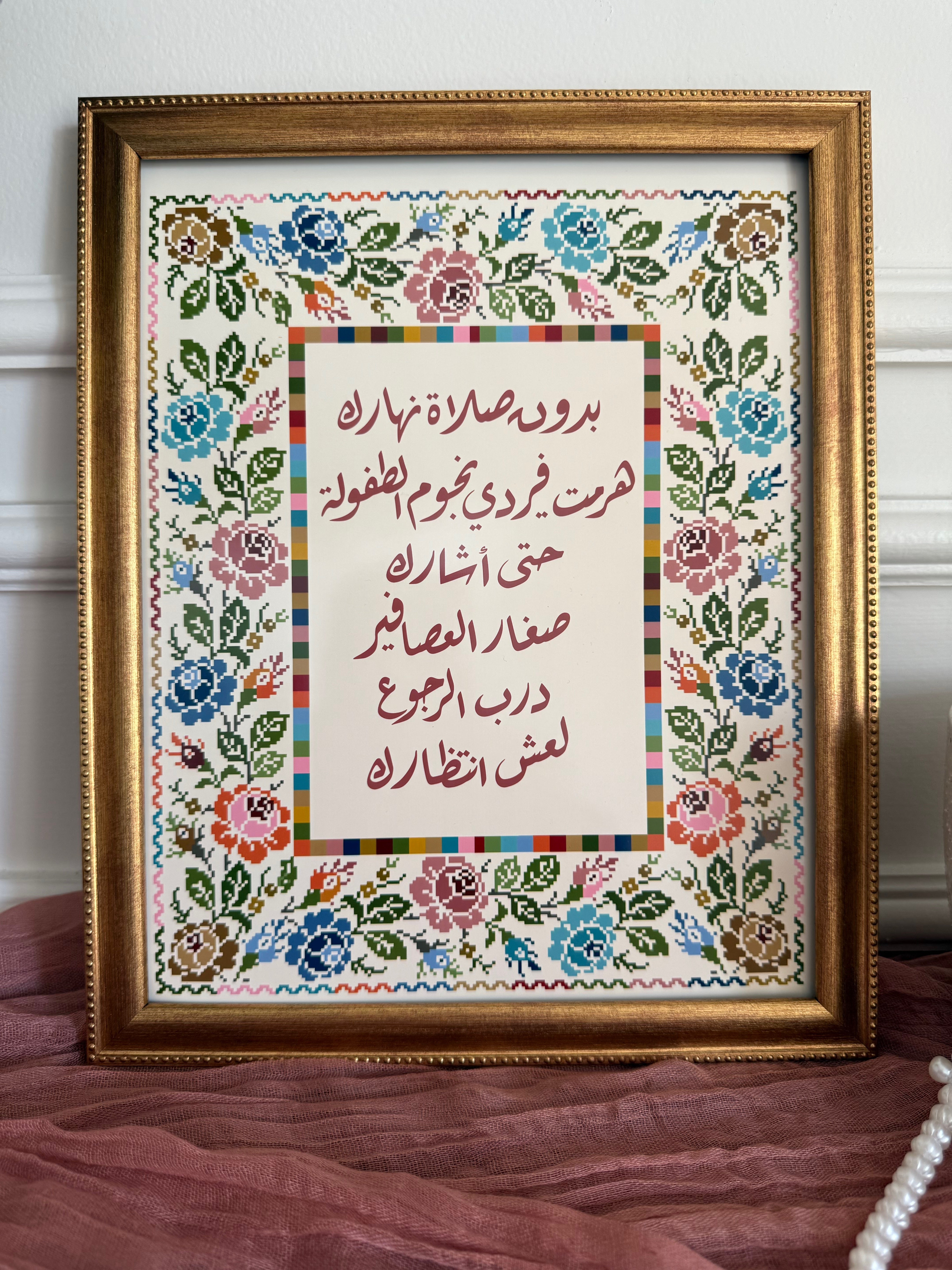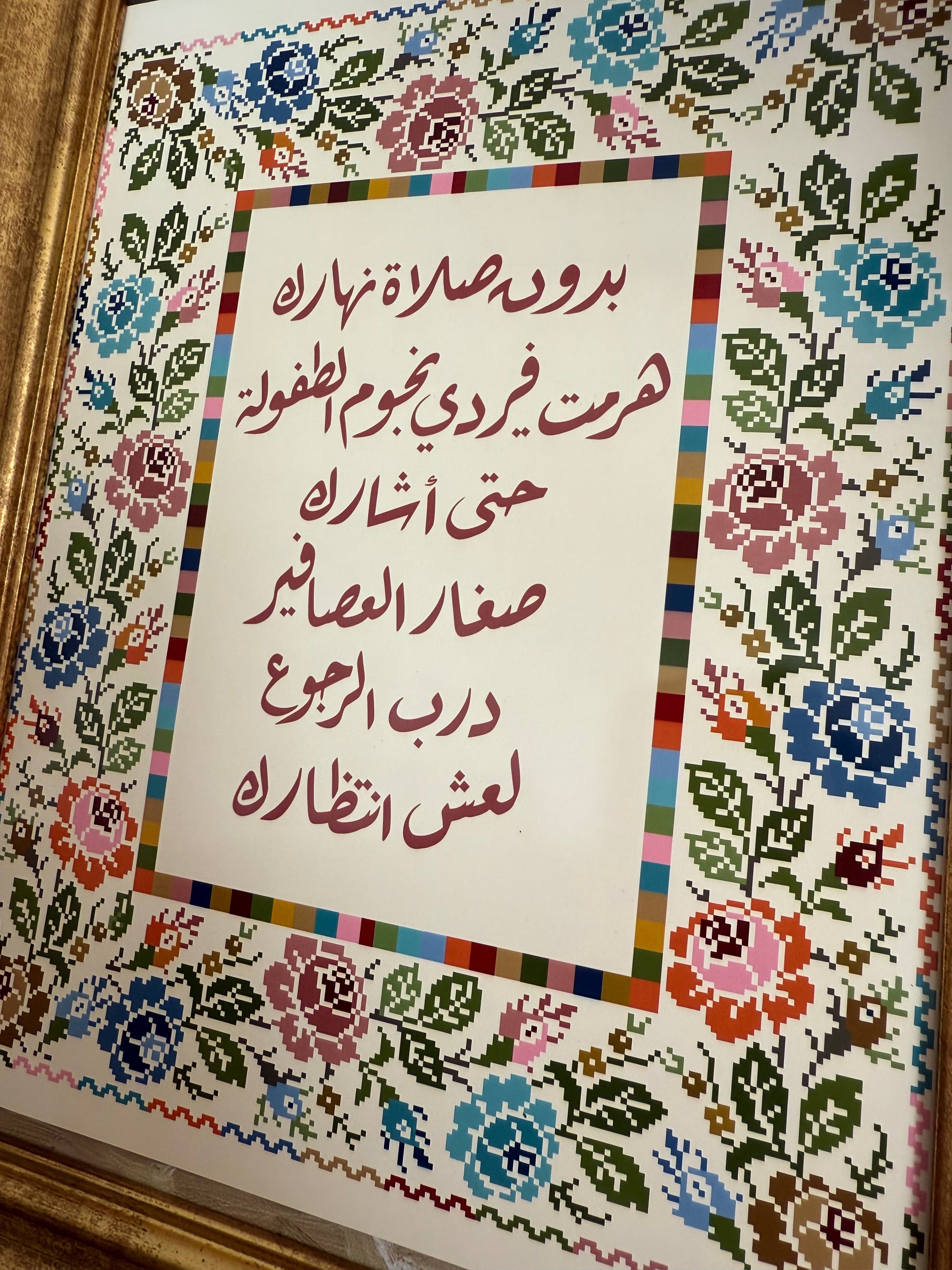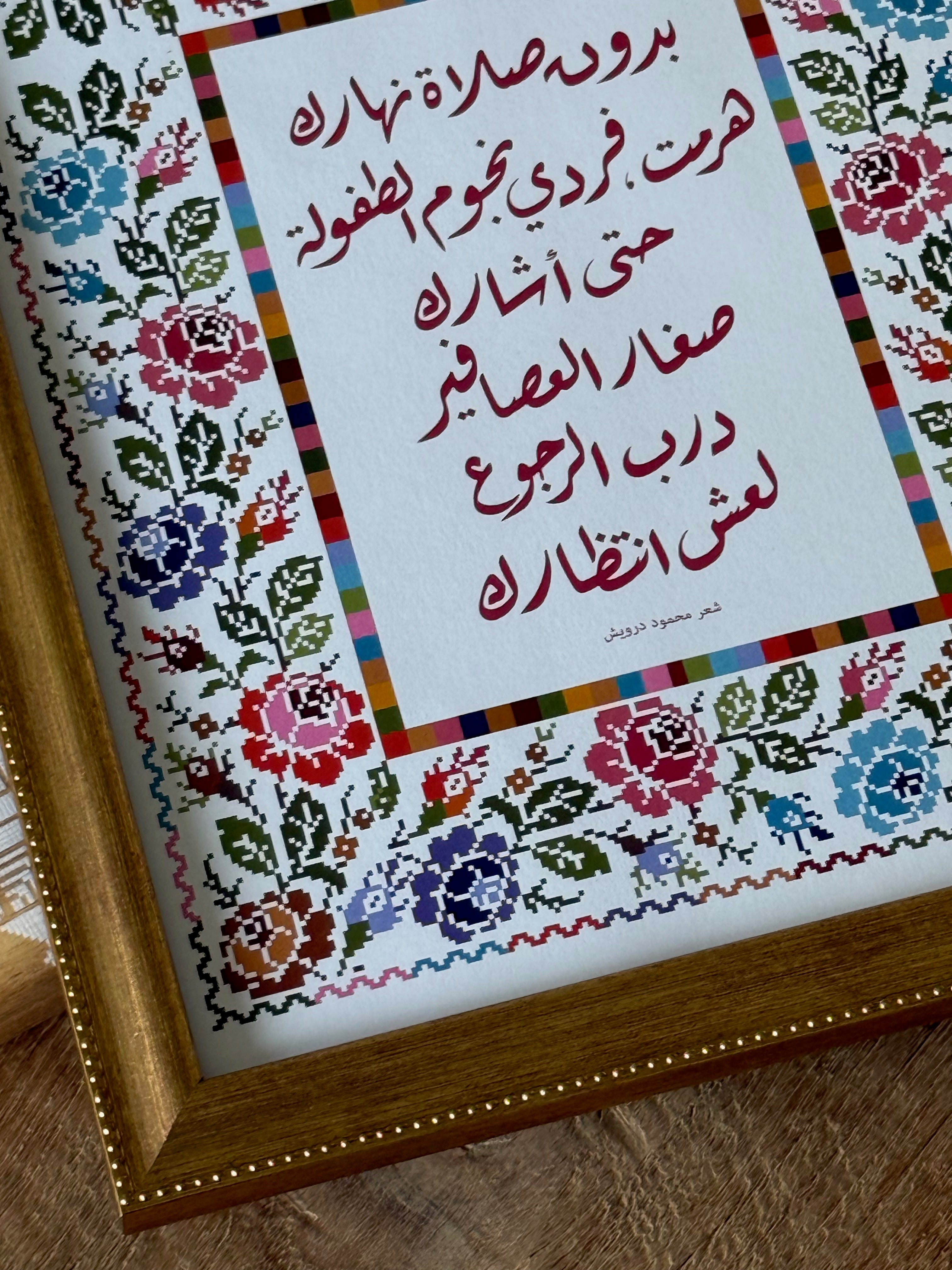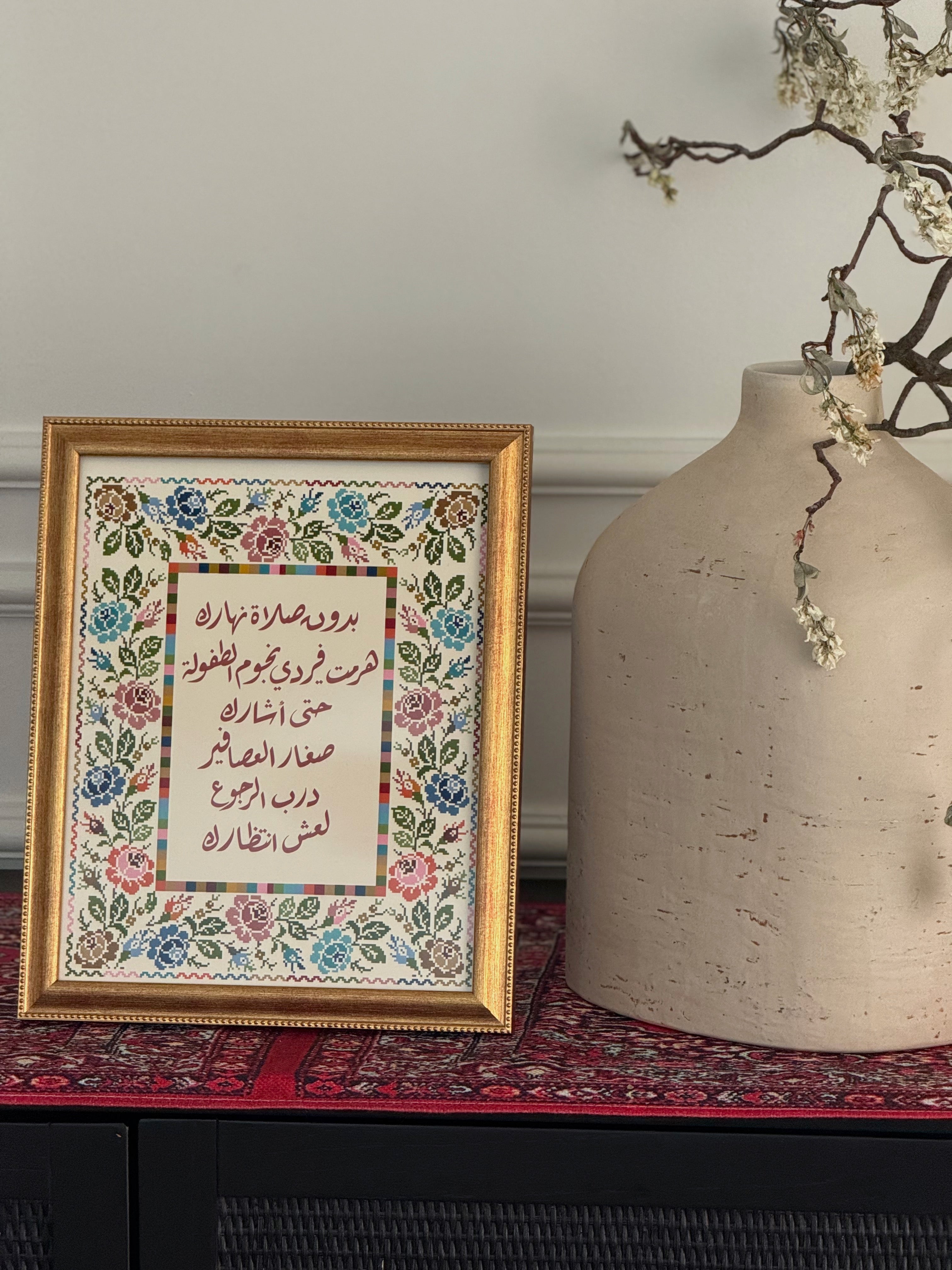 A tribute to mothers through the powerful words of renowned Palestinian poet Mahmoud Darwish surrounded by a delicate tatreez embroidery-inspired border. This poem "To My Mother" was written by Mahmoud Darwish when he was imprisoned. The poem describes how he longs for his mother's comfort and wishes to return to her. The text featured in the poem translates to :